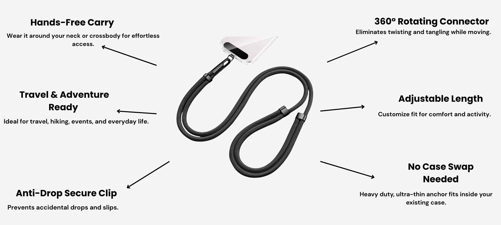 Stay moving without missing a moment. Designed for life on the go, this sleek phone strap keeps your phone secure and accessible while you hike, travel, explore, or power through your daily routine. Lightweight yet durable, it lets you stay hands-free wherever the day takes you—so you can focus on the adventure, not your pockets.